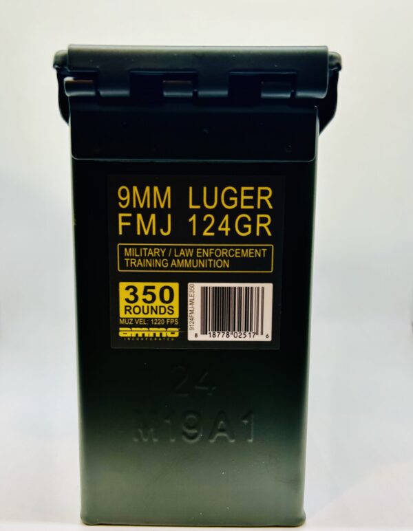 Ammo Inc. 124gr FMJ Military / Law Enforcement Training Ammunition. This mil-spec 9mm ammo is packaged in seven 50rd boxes that are sealed in a new M19A1 ammo can.