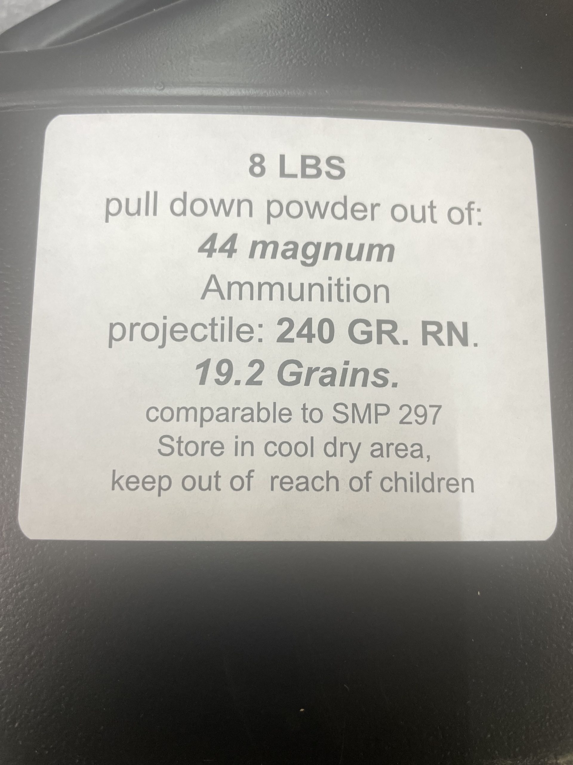 44 Magnum pull down powder, powder was extruded out of Ammo Inc. 44 Magnum with 240 Grain projectile and approx. 19.2 grains. We believe the powder is SMP 297, but we are not positive. Powder comes in 8LB jugs and there will be a $37.50 Haz-mat fee plus shipping. A direct signature is required for powder.