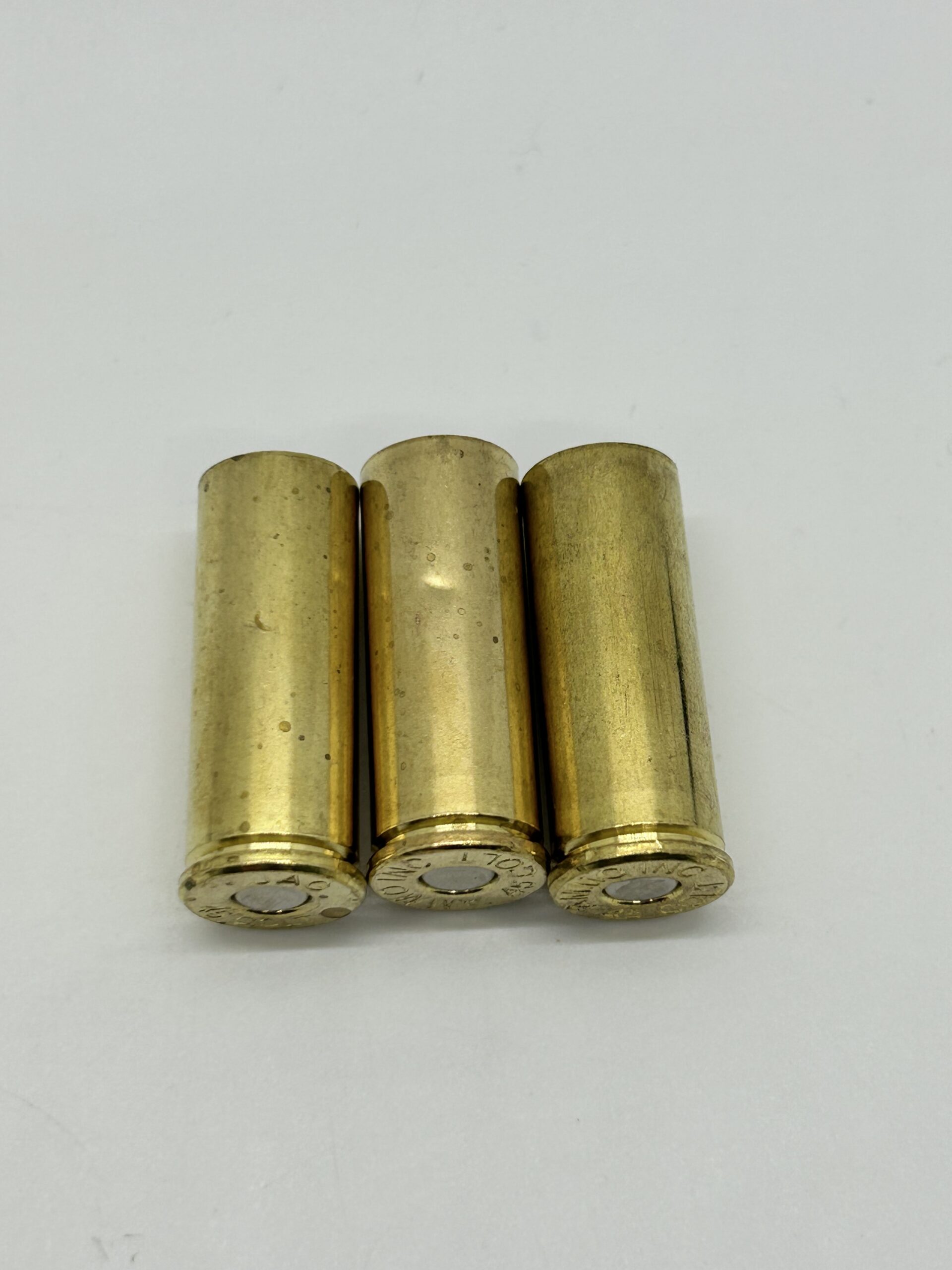 45 colt Boxer primed brass. Brass is boxer primed and non-corrosive with JAG and Ammo Inc 45 colt head stamp. This brass needs to be ran through a neck sizing die. 500 piece count. Some cases will have small dents. See picture. Keep an eye out for the occasional 44 mag brass.