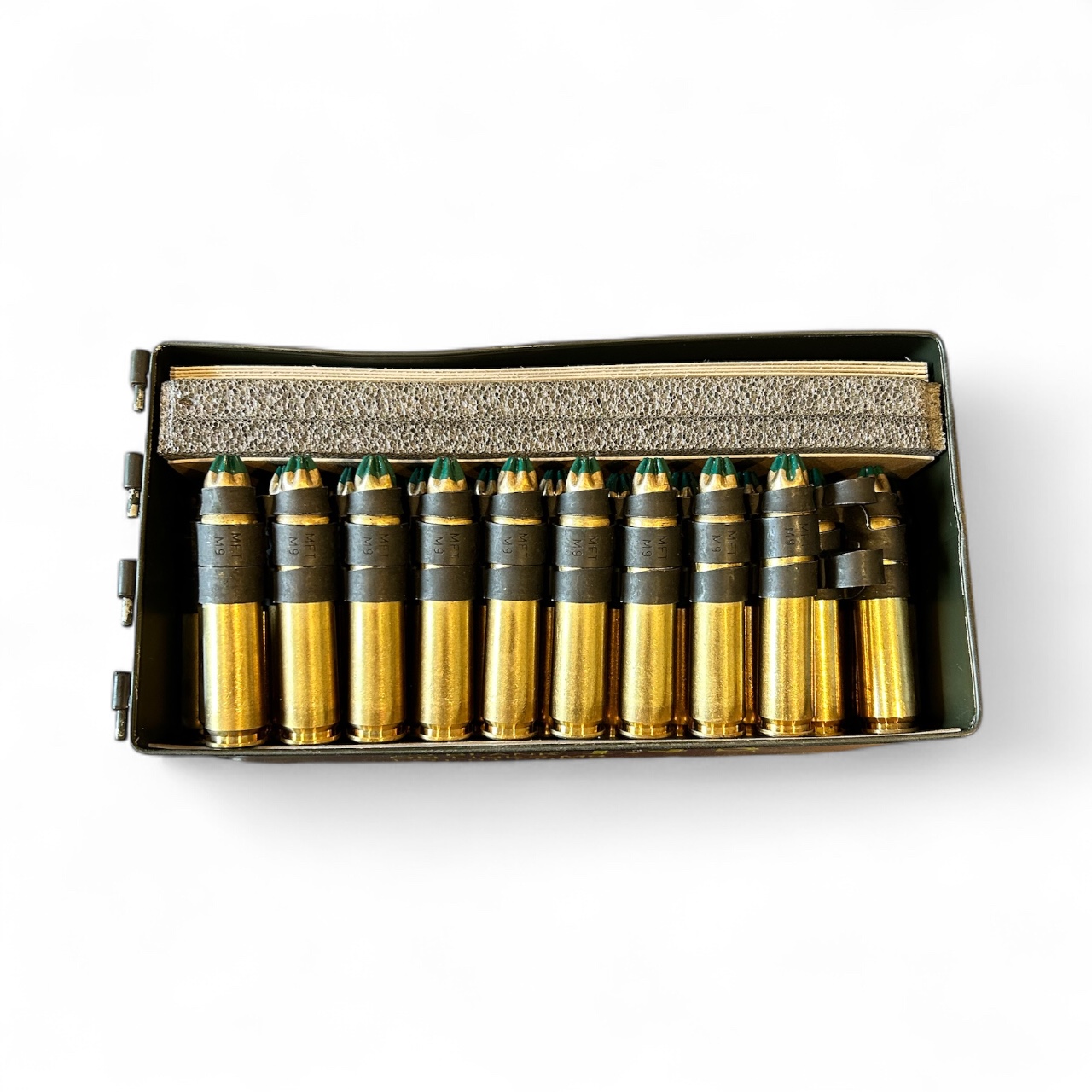 These are live blanks — they contain primers and produce explosive gas and loud muzzle report; they are NOT inert. Always follow established range and weapons-handling procedures: