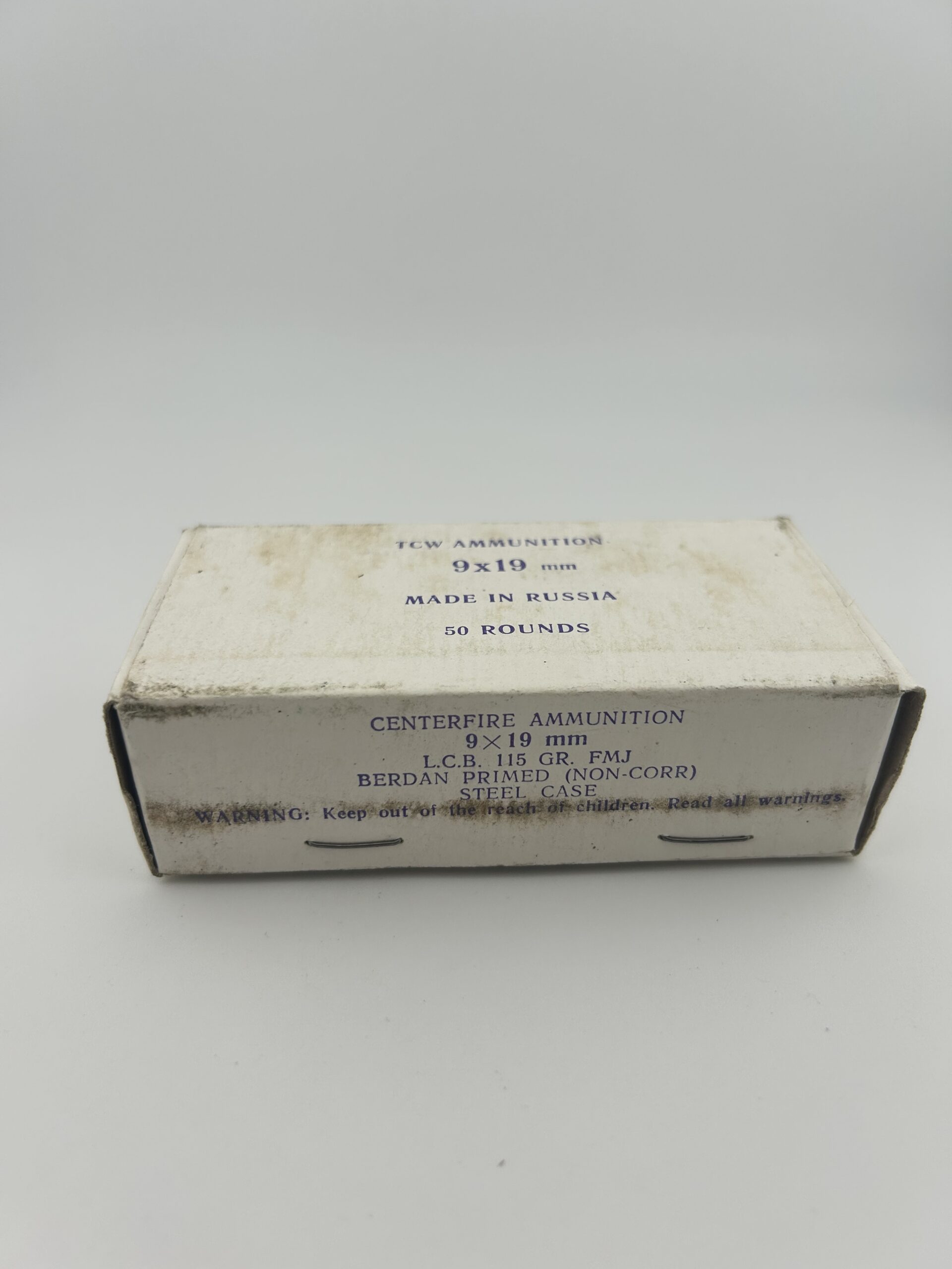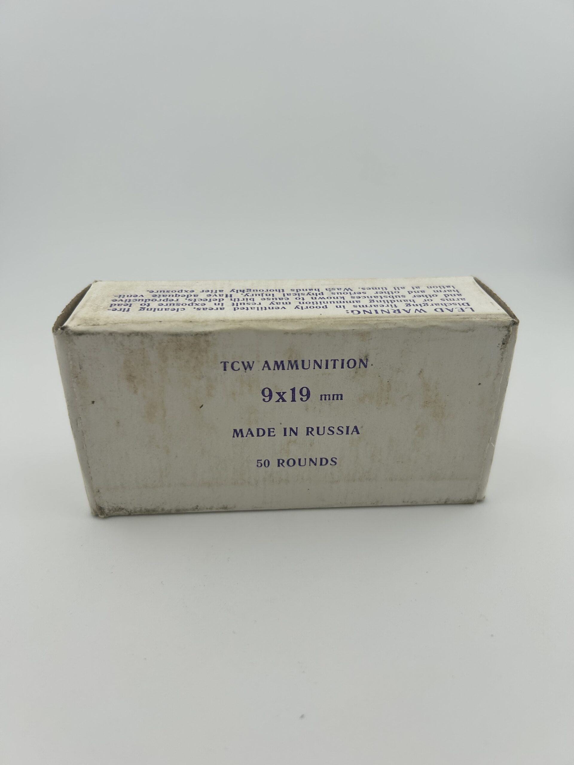 9mm TCW Ammunition. Made in Russia. 115 Grains, Non-Corrosive, Berdan Primed, Steel Case. 50 Rounds