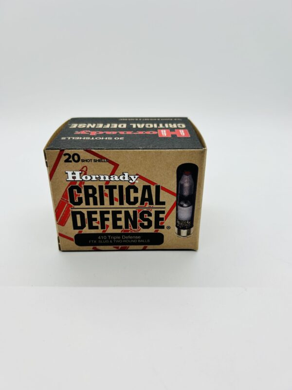 Delivering effective shot patterns that place all projectiles on a man-sized target at seven yards, the Critical Defense® 410 features a unique Triple Defense® projectile column consisting of two 35 caliber round balls topped with one non-jacketed FTX® slug.