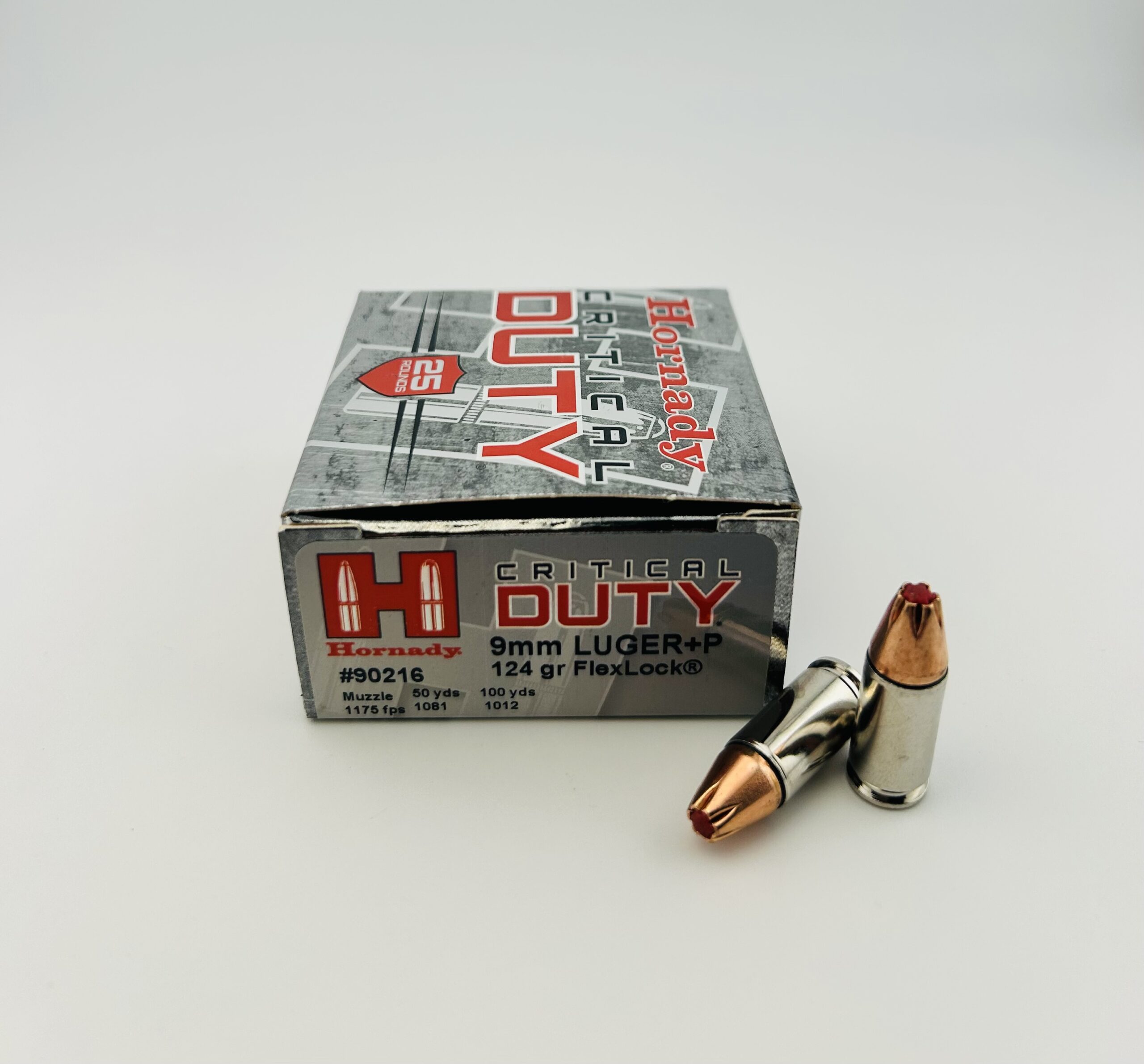Hornady Critical Duty 9mm Luger +P Ammo is designed to meet the needs of those who demand superior barrier penetration and prefer a full-size handgun for their personal protection. Critical Duty is loaded with the tough Hornady FlexLock bullet that delivers “barrier blind” performance when shot through common urban barriers.