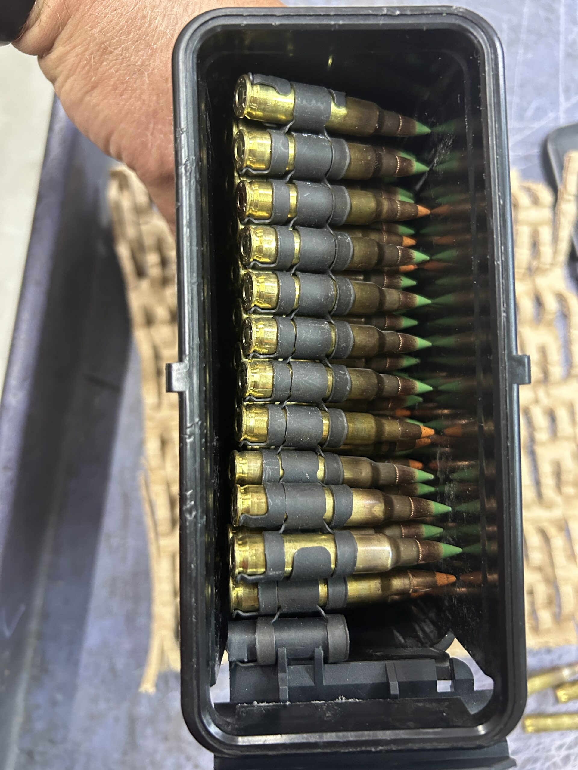 M855 and M856 Tracer ammo linked 4 to 1 in a M249 200 round SAW Box.