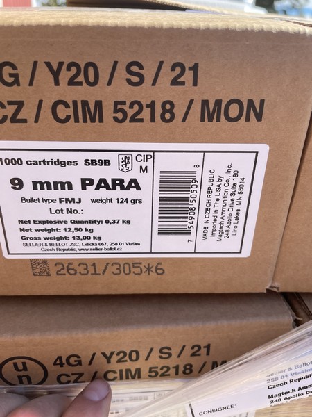 Sellier and Bellot 9mm Brass case, 124 Grain FMJ ammo. 50 round box