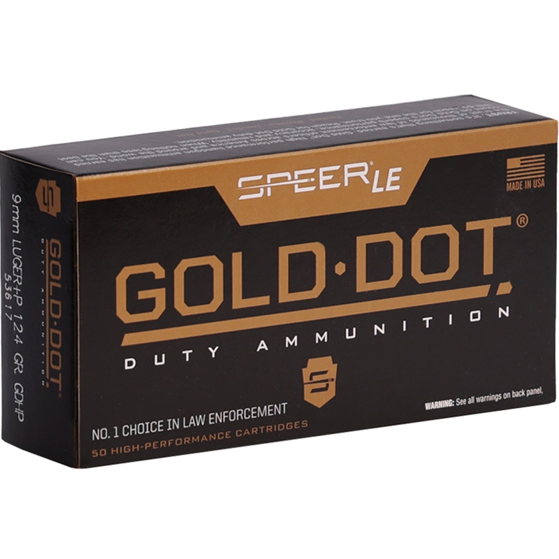 Speer Gold Dot LE Duty 9mm Ammo 124 Grain +P Jacketed Hollow Point. 50 RD box